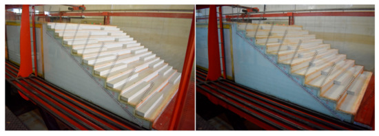 The Froude similitude in an open-channel, clear-water flow is considered sufficient for a similarity between the model and the prototype. In a highly turbulent air–water flow, the roles of viscosity and surface tension should be included for similar aeration processes between the model and the prototype. Consequently, the scale ratio λ, the Froude number Fr = q/(gy3)0.5, the Weber number We = ū/(σ/(ρLS))0.5, and the Reynolds number Re = q/υ are relevant. Here, y is the water depth, ū = q/yi the average velocity with yi as the mixture flow depth, σ the surface tension between air and water, ρ the water density, Ls = (h/cosθ) the distance between two step edges, and υ the kinematic water viscosity. Boes and Hager [59] investigated scale effects. For a standard prototype step height of 0.60 m, minimum Reynolds and Weber numbers and a maximum scaling factor to minimize scale effects were suggested. For a standard step height of 0.60 m, 1 m downstream of the spillway crest, the ranges of Fr, We, Re, and yc/h for the herein-studied physical models using λ = 10 are 2.70–5.81, 48–93, 1.80–3.50 × 105, and 0.79–1.23, respectively, thus partially satisfying the above conditions.