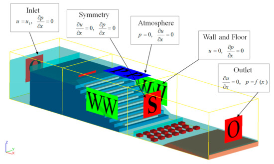 In the fluid domain, the boundary conditions were set according to the experimental condition. In the upstream of the domain, a discharge flow rate (Q) definition was set. The downstream section (outlet) of the domain was treated as an outflow (O) boundary condition. The bottom and the sides behave as rigid walls (W). No-slip conditions are expressed as zero tangential and normal velocities (u = v = w = 0, where u, v, and w are the velocities in the directions x, y, and z, respectively) that were used at the wall boundaries. For the upper boundary, the atmospheric pressure boundary condition due to the flow to enter and leave the domain as null von Neumann conditions was imposed on all variables except for pressure, which is set to zero. Symmetry (S) was used at the inner boundary conditions as well. A simple scheme of the computational domain and associated boundary conditions can be observed in Figure 7.