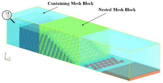 Then the grid independence is achieved. The parameters of the Grid Convergence Index (GCI) were calculated from Equation (17) through Equation (19) and are shown in Table 3. Since the GCI values for the finer grid (GCI12) are small as compared to the coarser grid (GCI23), it can be inferred that the grid-independent solution is almost obtained and no further mesh modification is required. Computed values of GCI23/rpGCI12 close to 1 indicate that the numerical solutions are within the asymptotic range of convergence. As a result, the mesh consisting of a containing block with a cell size of 1.3 cm and a nested block of 0.95 cm was selected (see Figure 8).