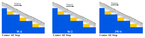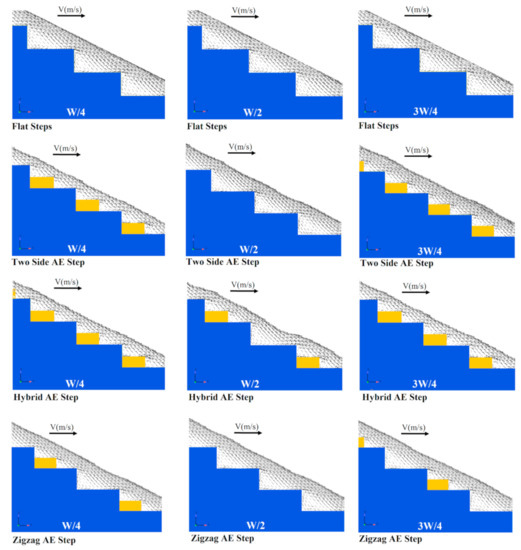 Figure 10 shows the representative streamlines on steps in each configuration. Three transverse locations were taken for all configurations: W/4, W/2(centerline), and 3W/4. As shown in Figure 10, the flow surface over steps of the flat stepped spillway was approximately parallel to the pseudo-bottom [26,49], although appendance elements on the step presented some instabilities caused by the staggered configurations. It is evident that, for appendance elements on the step, the vortex was divided into two areas in the recirculating zones on the step and appendance elements. Also, the simulations indicate that numerical models can predict recirculation zones [26,50,51,52,53].
