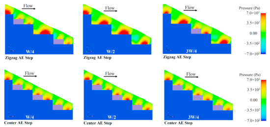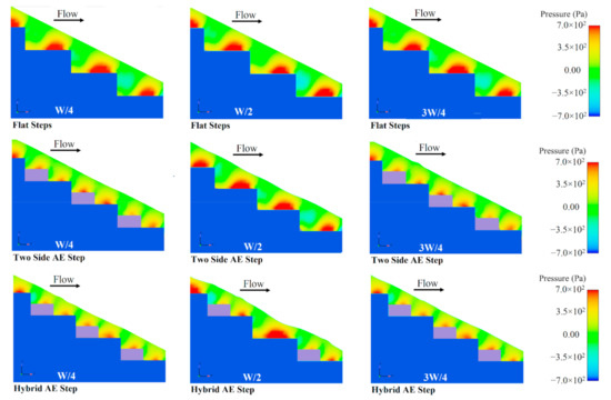 Figure 11 displays pressure contour for different configuration steps with the same slope and discharge. The pressure value on the step in flat steps is larger compared to other configurations with appendance elements, and the location of maximum pressure moves from a point in the step center towards the end of the step. Negative pressures can be observed in the flat stepped spillway: The maximum value occurred at the upper part of the step wall on the vertical face of the step. For all the proposed configurations (flat and appendance elements on step), pressure values near the step are never negative: since cavitation occurs in regions of low pressures, it is most likely to occur along the vertical step surface; with appendance elements on the step, negative pressures are divided into smaller, i.e., therefore, less subject to cavitation.