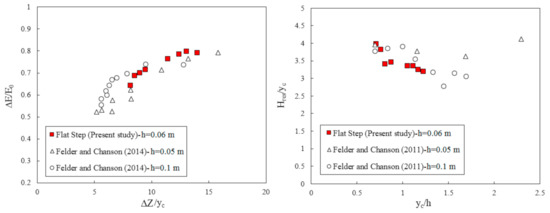 The residual energy at the chute’s downstream end is an important design parameter for the downstream energy dissipator, typically a stilling basin. The size of this stilling basin must be designed to allow the dissipation of the remaining energy to avoid damage and erosion of the river further downstream [54]. The rate of energy dissipation and residual head on the flat step is illustrated in Figure 12 as a function of the dimensionless variable of yc/h and ∆Z/yc, respectively. The present data for the flat steps are compared to a previous study with the same chute slope (θ = 26.60°), but where the step dimensions are not generally the same conducted by Felder and Chanson [14], in which ∆Z is the height of the dam, yc is the critical flow depth, and h is step height. The residual head, Hres, is: