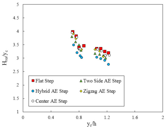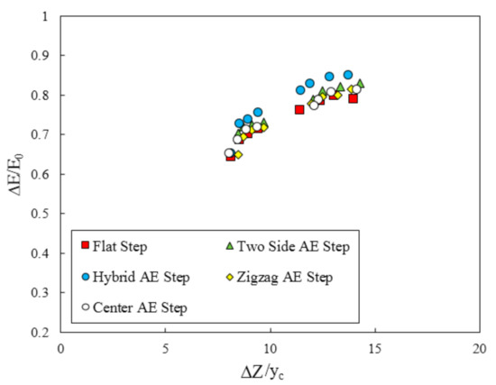 The term V = q/y1 represents the mean flow velocity at the downstream end of the spillway. Also, θ, y, and g are the slope of the chute, the water flow depth, and the gravitational acceleration, respectively. From the results in Figure 11, the energy dissipation rate increases with increasing ∆Z/yc, which means that the energy dissipation rate decreases with increasing discharge, which is consistent with results from earlier studies of stepped spillways [14]. In addition, from the comparison of the results, as expected, a higher rate of energy dissipation was observed for the flat stepped spillway at low flow rates. According to Bung [10], energy dissipation is not related to step height. At low flow rates, the residual head is decreased due to the increasing discharge for all cases and it remained almost constant for the largest flow rates. However, for the largest flow rates, the discharge was not fully developed at the downstream end of the spillway and the residual energy might be overestimated [16,55]. The present findings are in good agreement with previous studies on stepped spillways with slopes of θ = 26.60°.