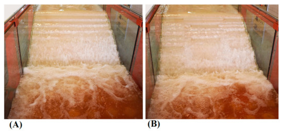 In the nappe flow pattern, the water passes from one step to the other, developing a small hydraulic jump on every step. This jump can be observed for a small ratio of (yc/h) (yc is the critical flow depth and h is the step height), the skimming flow regime is observed for the higher discharges according to Chinnarasri and Wongwises [30], and with a large value of (yc/h). The factors that affect the generation of various types of flow on stepped spillways include the geometry of the steps (length and height of the steps, l and h) and the flow rate Q [1,2]. However, some researchers have proposed other criteria. The studies of many researchers such as Rajaratnam [3], Peyaras et al. [4], and Chanson [5] have shown that the type of flow regime depends on the normalized critical depth, yc/h, and a dimensionless variable of steps, h/l. According to Equations (1)–(3), criteria are presented for which a skimming flow regime occurs: