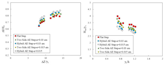 Figure 15 illustrates some differences in the residual head for the different step configurations: the residual head reduced more in the stepped spillway with the hybrid appendance elements step in comparison with the other step configurations and the flat stepped spillway under all discharges. For the smaller flow rates, the residual head decreased with increasing discharge for all models, while it was about constant for the largest flow rates. Under the same flow conditions, the dimensionless residual head on the flat stepped spillway is the largest (~3.47), while the average dimensionless residual head on the hybrid appendance elements step is ~3.02.