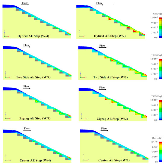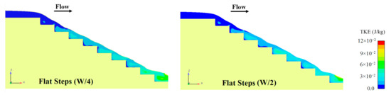 - Adding appendance elements increases the deflected jets on the steps and maximum TKE is created on the appendance elements step compared to the flat step. The area of turbulence on hybrid appendance elements was of greater intensity than other types of arrangement of appendance elements step.