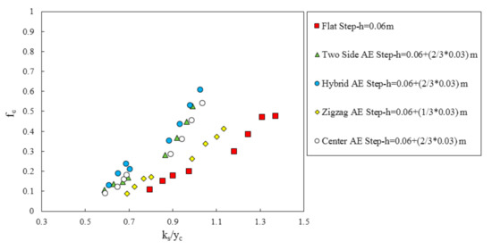 Darcy friction factors of stepped spillways with appendance elements on step versus (ks/yc).