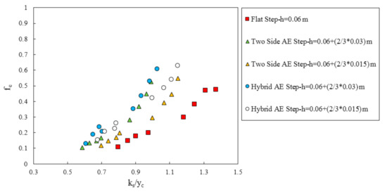 - It is observed that the friction factor (fe) in the flat stepped spillway is lower compared to when appendance elements are used on a step of the stepped spillway. The maximum friction factor demonstrates an increasing trend with an increase in the ks/yc values.
