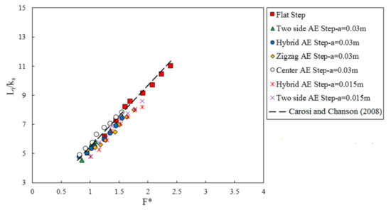 The locations of the inception point are presented in dimensionless terms as Li/ks as a function of a Froude number F* in Figure 21. Herein, Li is the longitudinal distance from the first step brink to the beginning of the inception point location and ks is the roughness height. The Froude number F* is defined: