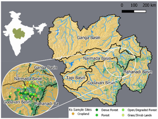 Central Indian highlands with the five major basins delineated. Forest cover is shown in green while agriculture is in yellow derived from the European Space Agency (ESA) Land Cover 2010 data reclassified. The inset map shows the sampling area for infiltration tests and the final sampled locations. The color of the sample locations represents the land cover.