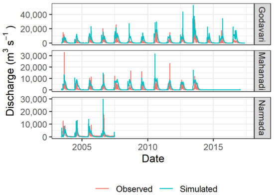 Observed versus daily simulated discharge for the three river basins with available discharge data for the study period.