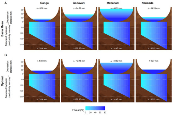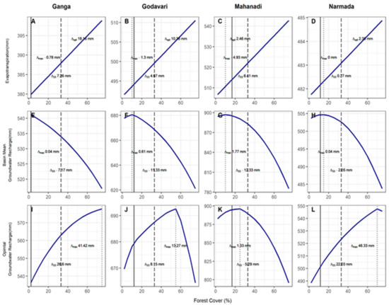 The four river basins modeled showed similar outcomes for the basin mean pathway but differed for the groundwater recharge optimized pathway. For the basin mean, all four basins are quite close to their maximum groundwater recharge at current forest cover (Figure 6E–H). Only the Narmada would benefit from a marginal increase in forest cover (Figure 6H). All four show a loss in groundwater recharge at the target of 33% forest cover ranging from −12 mm in the Godavari to −2 mm in the Narmada. The optimized pathway shows the potential to increase groundwater recharge in all four basins ranging from 1 mm in the Mahanadi basin to 46 mm increase in the Narmada basin (Figure 6I–L). Only the Mahanadi maximizes its groundwater recharge before 33% forest cover at ~25%. The other basins maximize groundwater recharge at 55%, 70%, and 75% for the Godavari, Narmada, and Ganga, respectively. The groundwater recharge increase, from current to 33% forest cover, is −5 mm for the Mahanadi basin to 27 mm for the Ganga basin. The difference between the two pathways and between the basins can be explained by the difference in depression storage over the range of forest cover (Figure 6).