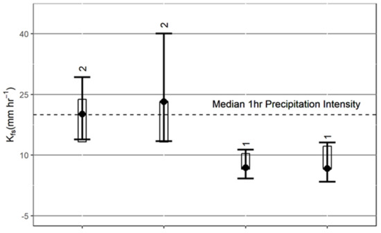 The results of the analysis of variance of Kfs are significant F (3, 105) = 2.815, p = 0.043 for land cover. There are significant estimated marginal means (EMM) differences between treed land cover (forest and plantations) and non-treed (grass/shrubland and cropland). Forest land cover had an EMM Kfs of 20.2 mm/h−1, while cropland had the lowest EMM Kfs of 6.7 mm/h−1 (Figure 4). Teak plantations had the highest EMM Kfs of 23.2 mm/h−1 but were not significantly different from natural forest cover. Grass/Shrubland Kfs has a lot of overlap with croplands with a EMM Kfs of 7.0 mm/h−1. Above-ground biomass was also a significant predictor in the model for forested areas, suggesting that forest quality can have an impact on Kfs. To put the results in context, hourly precipitation intensity computed from the Jabalpur weather station in the Integrated Surface Dataset reveals that median precipitation intensity exceeds forest Kfs approximately 46% of the time compared to cropland where median precipitation intensity exceeds Kfs about 67% of the time.