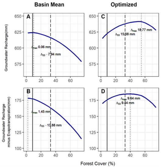 Central Indian Highland’s groundwater recharge over the range of forest cover from 2% to 75% of the landscape. Graph (A) represents the groundwater recharge for the basin mean pathway for increasing forest cover while Graph (C) represents groundwater recharge optimized pathway to increasing forest cover. Graphs (B,D) subtract the increase in evapotranspiration from groundwater recharge to represent water losses from the landscape because of increasing forest cover for the basin mean pathways (B) and groundwater recharge optimized pathway (D). Δ33 indicates the change from current forest cover (solid vertical line) to forest cover at 33% (dashed vertical line) while Δmax indicates the change from current forest cover to the maximum (dotted vertical line).