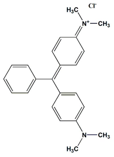 The NICs adsorbents were obtained: bentonite from Pakistan (PB), bentonite purchased from Alfa Aesar (BT), and red mud from Turkey (RM). The NICs samples were ground and washed with boiled distilled water followed by a filtration process to remove the soluble impurities. After that, NICs samples were then dried in an oven for 24 h at 80 °C and ground. Sodium hydroxide, hydrochloric acid, and malachite green is a water-soluble cationic dye that belongs to the triphenylmethane category (chemical formula: C23H25ClN2, color index number = 42,000, molar mass: 364.91 g/mol, abbreviated as MG) were obtained from Sigma Aldrich, and used without further pre-treatment. The structure of the MG is shown in Figure 1.