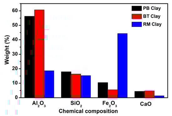 The XRF analysis was carried out to investigate the chemical compositions of the NICs used adsorbents. Table 1 shows that PB and BT clays are mainly composed of alumina and silica, while the major components of the RM clay are iron oxide, alumina, and silica, with other oxides present in trace amount in all of the NICs samples. Figure 2 shows the major chemical constituents present in NICs samples.