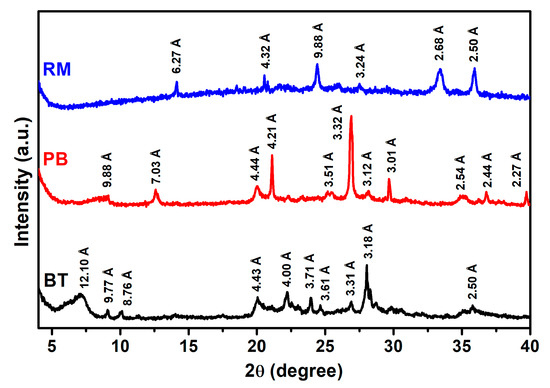 XRD patterns of bentonite purchased from Alfa Aesar (BT), Pakistani bentonite clay (PB), and Turkish red mud (RM) adsorbent.