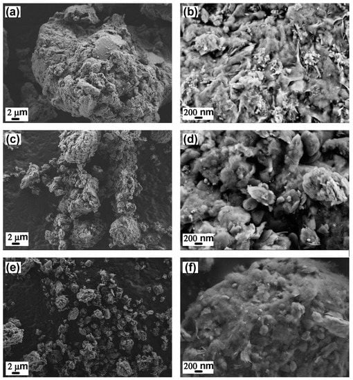 SEM images of (a,b) BT, (c,d) PB, and (e,f) RM adsorbent.