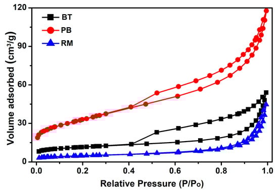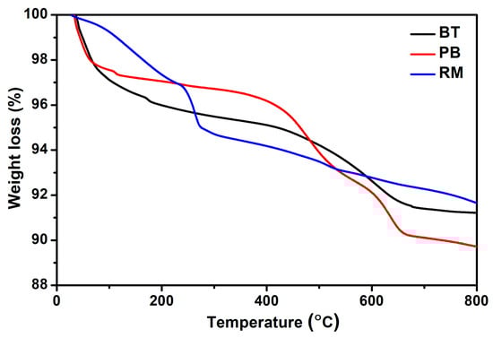 Thermogravimetric analysis (TGA) of BT, PB, and RM adsorbent.