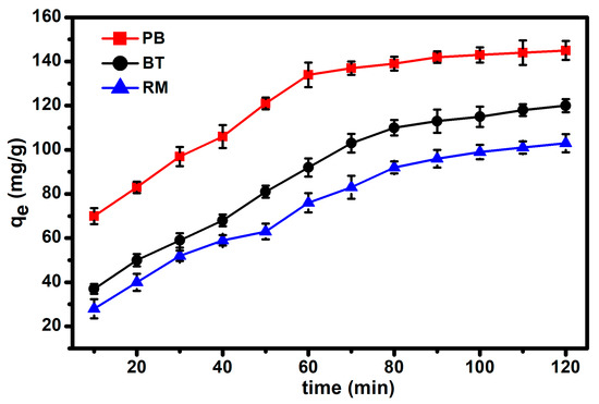 To determine the influence of the initial MG concentration on the adsorption capacities, the experiments were performed by changing the concentration in the range of 100–350 mg/L, keeping other conditions constant. The results are shown in Figure 11. It was determined that the adsorption capacities of MG onto NICs adsorbents increased from 92 to 223 mg/g for PB, 69 to 149 mg/g for BT, and 57 to 125 mg/g for RM as the initial concentration increased from 100 to 350 mg/L. Moreover, at higher concentrations, the adsorption uptake rate was also higher due to the higher concentration gradient [61].