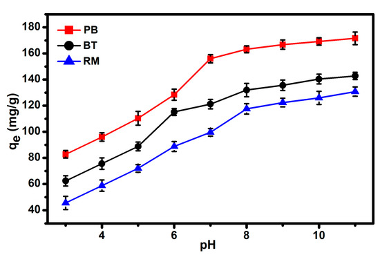 The initial solution pH is a foremost significant controlling parameter in the process of dye adsorption, as it can directly influence the adsorbent surface charges, the solute’s dissociation, and as the adsorption mechanism [56]. It is also associated with the structural changes and color intensities of dye molecules and is directly related to the competitive adsorption process between the MG molecules and hydrogen ions [57]. The influence of initial pH on the adsorption characteristics of MG by NICs adsorbents was examined in the pH range of 3–11. According to the results (Figure 9), the adsorption capacities of NICs adsorbents increased from 45.6 to 130.8 mg/g for RM, 62.4 to 142.8 mg/g for BT, and 82.8 to 170.6 mg/g for PB, with the increase of pH of MG solution from 3 to 11, respectively. In an alkaline environment, the surface functional groups (Si-OH and Al-OH) of the NICs were deprotonated by –OH, due to which the surface became negatively charged; as a result, the electrostatic interaction between anionic NICs surfaced and cationic MG molecules increased [1], whereas at low solution pH, the H+ ions concentration was very high, thus competing intensely with the cationic dye to occupy the adsorption site, therefore causing a reduction in the adsorption of MG dye [58].