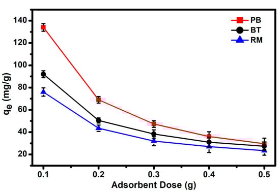 It is essential to analyze the effect of the adsorbent amount, to optimize and select the best-required dose of an adsorbent for scaling-up and designing large-scale equipment [59]. The influence of adsorbent dosage on dye adsorption is presented in Figure 10. The obtained results show that increasing the NICs dose from 0.1 to 0.5 g resulted in decreases in the adsorption capacities from 76 to 23.4 mg/g for RM, 92 to 27.4 mg/g for BT, and 134 to 29.6 mg/g for PB. The resulted decrease in adsorption capacities is due to the increasing NICs dose (0.1 to 0.5 g), while the number of MG molecules remained fixed (Ce = 100 mg/L). Hence, at a higher NICs dose, some of the surface-active sites of the NICs remained empty [60].