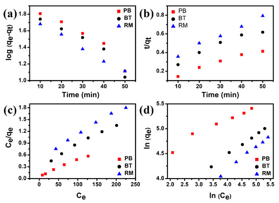 where KL (L/mg) represents the adsorption equilibrium constant for the Langmuir model and is related to the adsorption energy, qe and qm are the equilibrium adsorption amount of adsorbate and monolayer adsorption capacity of adsorbents in the experiments (mg/g), respectively, and Ce (mg/L) is equilibrium adsorbate concentration.