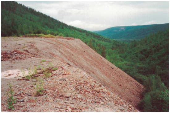 The natural mountain–taiga landscape of the Elkon horst was heavily disturbed by a long-term and large-scale geological prospecting for radioactive raw materials, which were carried out here during the last third of the 20th century. As a result of these works, more than 1 million tons of ore were extracted and stored on the surface as dumps. The total amount of uranium contained in this ore reaches 2000 tons. This fact assumes a high degree and significant scale of radionuclide contamination of the soil, vegetation cover, and surface waters of the area, considering the landscape and climatic conditions of this region. The dumps, as a rule, are confined to the bottoms and slopes of valleys of small rivers and creeks, and their constituent components, including natural radionuclides, subjected to intense wind and water dispersion by the processes of hypergenic weathering [22].