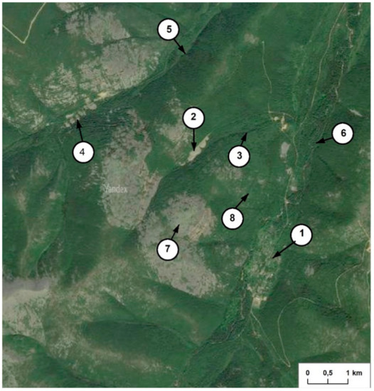 Satellite image of the study area: 1—Zarechny village; 2—Kurung site; 3—Propadayushiy Creek; 4—Akin site; 5—Akin Creek; 6—Kurung River; 7—tundra mountain tops and stony heaths; 8—watershed slopes with mountain–taiga vegetation.