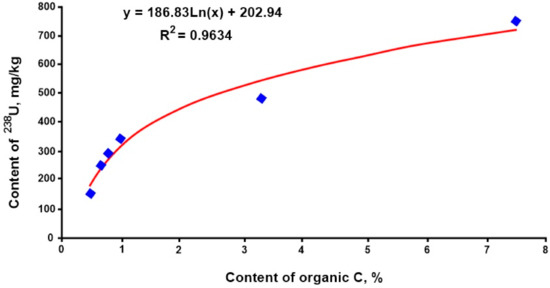 To study the effect of organic matter on the accumulation of the radionuclides studied, silty bottom sediments enriched in the organic matter were taken in close proximity to the dumps, and the content of natural 238U and 226Ra radionuclides was analyzed. The results of the analysis showed that the content of uranium in silty deposits depends on the concentration of organic matter in them, increasing with an increase in the content of the latter. This correlation can be approximated by a logarithmic function (Figure 4). The value of the correlation coefficient between the content of 238U and organic carbon was 0.961 and statistically significant at a 0.05 significance level. As for radium-226, no statistically significant correlations were found between its concentration and sediment organic carbon. In general, these data support the results of similar studies described elsewhere [6,40].
