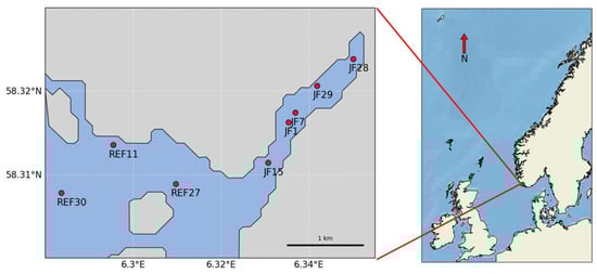 Position of stations in the Jøssingfjord (stations JF15, JF1, JF7, JF29, and JF28) and in the open sea (REF11, REF27, and REF30).