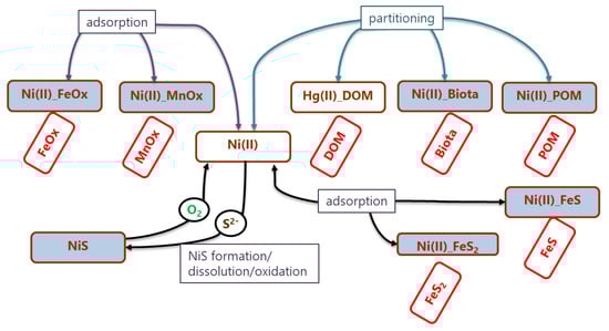 In this work, a new module, brom_ni, was elaborated. This module considers the transformation of different species of Ni in line with changes of other BROM variables (Figure 2). We parametrized reactions of Ni(II) and NiS (formation, dissolution, oxidation) and Ni(II) adsorption on oxides of Fe and Mn as well as on FeS and FeS2. We also parameterized Ni(II) partitioning with particulate and dissolved organic matter (labile POM and labile DOM) and its bioaccumulation by biota (Figure 2). Adsorption and bioaccumulation were parametrized according to Katsev et al. [29]. Bioaccumulation by biota includes autotrophs, heterotrophs, and all types of bacteria. The code of this module with the comments and the values of coefficients used is available at https://github.com/BottomRedoxModel/brom_niva_module/tree/master/brom (accessed on 27 March 2021).