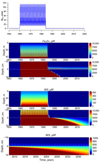 We first simulated the “baseline solution” for the system for conditions of the natural fjord seasonal variability with relatively low content of iron and nickel species entering the system and low burying rate (natural state (NS); model years 1940–1960, including the “spin-up” period 1940–1949 not shown in the figures). Then we simulated a 24-year period of high rates of deposition of tailings containing particulate Si, Fe2O3, and NiS (intensive deposition (ID); from 1960 to 1984). After 1984, restoration with the current low discharge (CLD) was modeled until 2040 (Figure 3). Burying velocity calculated in BROM depends on the amount of particulate matter that reaches the bottom. Therefore, during the period of natural conditions (years 1955–1960), the model reproduced the seasonal changes in burying velocity within the limits of 0.5–4.4 cm/year with a maximum following the period of synthesis of organic matter in the productive periods of the year. During the intensive tailing deposition, the burying rate oscillates within the limits of 30–130 cm/year, with an average value of about 50 cm/year. These oscillations can be explained by the seasonality of the mixing in the water column. During the winter period, an intense vertical mixing keeps the particles in suspended condition, while in the summer period under developed stratification, particles precipitate to the bottom. Therefore, the model predicted a 12-m decrease in the average depth of the fjord during the discharge period.