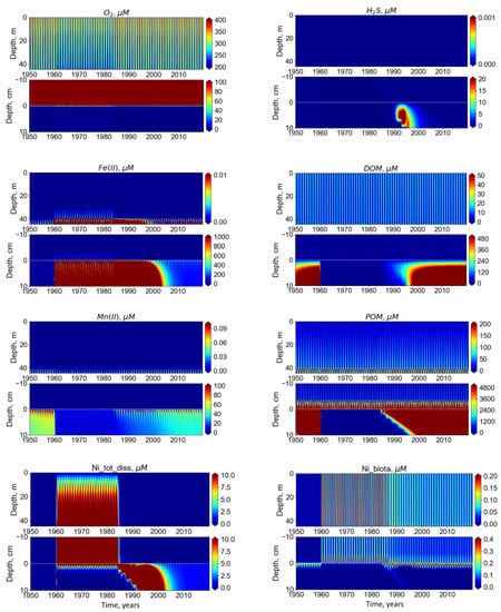 In natural conditions, Ni is characterized by low concentrations both in the water column (0.009 µM) and in porewater (maximum 0.6 µM). Practically all Ni is associated with DOM (Figure 8). The highest concentration of total dissolved Ni was observed in summer when active oxidation/reduction processes took place, resulting in desorption of Ni2+ adsorbed on Fe2O3, MnO2, and POM under their oxidative/reductive dissolution. Release of Ni to the bottom water followed the maximum concentration of Ni adsorbed on these suspended particles (Figure 8). In the natural condition, the model showed a significant seasonal variation of the benthic release flux of Ni following the annual OM formation/decay processes.