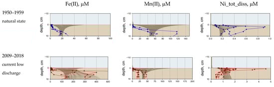 Comparisons of model results and observed field data are shown in Figure 5. The observations of dissolved Fe, Mn, and Ni distributions in the porewater were performed in the open sea (stations REF11, REF27, and REF30) and in the Jøssingfjord (stations JF5, JF7, JF11, JF28, and JF29) in 2015 [24] (Figure 1). Data for the open sea were taken to represent distributions before mine tailing deposition (natural state (NS)), and data in the fjord reflect a present state with low tailing deposition into the fjord (current low discharge (CLD)). According to the field data, concentrations of dissolved Fe and Ni are higher in the fjord than in the open sea, while the concentration of dissolved Mn is lower. This was consistent with high concentrations of solid Fe and Ni and low concentration of solid Mn in the tailings. Modeled porewater concentration levels of studied metals were consistent with the field data both for the period before mine tailing deposition and for the present day. High model concentrations of reduced Fe and Mn near the sediment surface result from the low penetration of O2 causing reduced Fe(II) and Mn(II) to be stable all the way up to the sediment surface. This is a typical distribution of Fe and Mn in many coastal and fjord sediments [34]. The distribution of dissolved Fe and Mn in the porewater has usual seasonality with maximum followed by high productivity period and intensive oxidation of OM by Fe and Mn oxides [35].