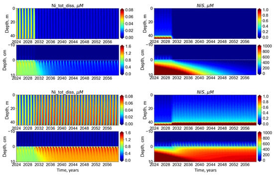 Modeled interannual variability of total dissolved nickel (left) and NiS (right) concentrations after total cessation (top) or doubling (bottom) of the current low deposition rate discharge in 2030.