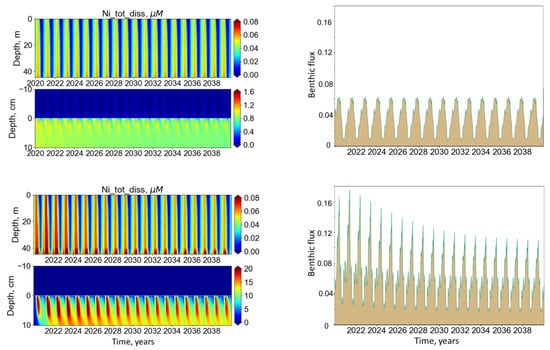 A numerical experiment with an increase in bioturbation that was initiated in 2020 clearly showed the importance of this factor for enhanced Ni leaching from sediment (Figure 7). After more active bioturbation was induced, dissolved Ni concentration increased from 0.06 to 0.15 µM in the water column, from 0.08 to 0.8 µM in BBL, and from 1.2 to 30 µM in porewater. The average annual benthic flux of dissolved Ni increased from 0.037 to 0.09 mmol/m2 day with a maximum of 0.18 mmol/m2 day. After 18–20 years, dissolved Ni concentration did not exceed 0.075 µM in the water column, 0.5 µM in BBL, and 20 µM in porewater. In this long-term perspective, the average Ni benthic flux decreased to 0.06 mmol/m2 day.