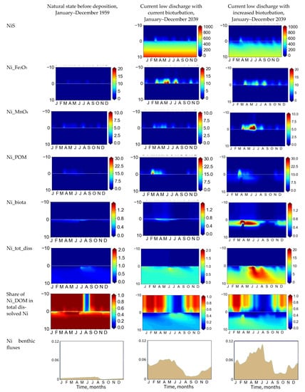 Modeled seasonal variability of concentrations of NiS, Ni adsorbed on Fe2O3 and MnO2, Ni associated with POM, bioaccumulated Ni, and total dissolved Ni (μM) and share of Ni_DOM in total dissolved Ni (%) and Ni benthic release flux (mmol/m3day): natural state before deposition (left), current low discharge with low bioturbation (middle), and current low discharge with increased bioturbation (right).