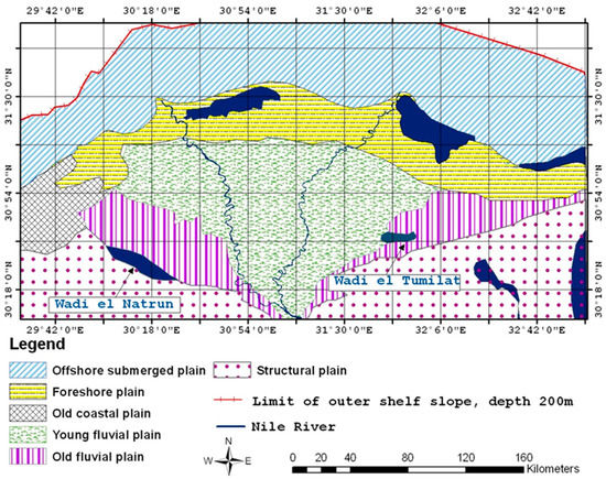 Figure 1 presents the geomorphologic features of the ND. The ground surface levels of the delta land ranges between 17 m above mean sea level (MSL) at the south to less than 1 m above MSL at the northern boundary [23]. It is composed of two plain regions including the foreshore plain characterised by the coastal lakes and their inland extension into brackish water lagoons, the young alluvial plains cover most of the ND region and are dominated by cultivated lands [24]. The Nile Delta is divided into three main regions, including agricultural land, a wetland portion, and a desert portion [4].