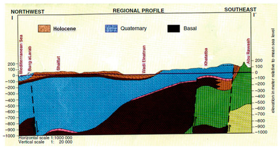 Two main geological components in the ND region are Quaternary deposits and Tertiary deposits. The Quaternary includes the Holocene and Pleistocene sediments. Holocene deposits are widely spread with maximum thickness of about 77 m [32]. Moreover, the thickness of Quaternary deposits increases in a northward direction to reach 250 m at the south and 1000 m at the north [33]. The Tertiary deposits including Pliocene, Miocene, Oligocene, Eocene and Paleocene sediments. El Shazly et al. [34] revealed that the lower Pliocene sediments are fluvio-marine and sandy clays. This forms the lower boundary of the Quaternary deposits. The hydrogeological cross section in the ND area is shown in Figure 2 [4].