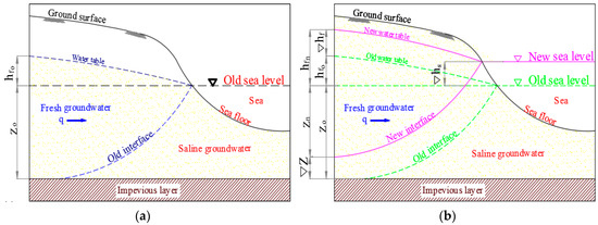 Schematic diagram of freshwater-saltwater interface position for (a) Freshwater-saltwater interface position (Ghyben-Herzberg) (b) Freshwater-saltwater interface position for incremental changes in the boundary condition.
