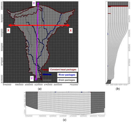 Visual MODFLOW (USGS, USA) is applied to simulate and investigate the groundwater flow in the MNDA. The study area is divided to 172 rows and 157 columns with cell area (1 km2) as presented in Figure 4a. The model is divided into 11 layer, the first layer is clay cap with depth ranged from 20 to 50 m and layers from 2 to 11 are divided into equal thickness. Two sections in X direction and Y direction are presented in Figure 4b,c.