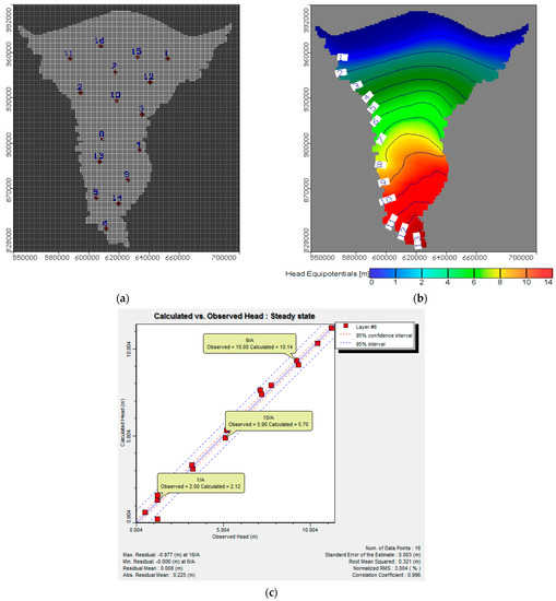 Calibration and results of groundwater flow model in MNDA (a) distribution of observation wells, (b) Areal view of groundwater head in MND aquifer, (c) Model calibration for calculated versus observed heads.