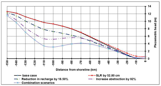 After model has been calibrated, the numerical model has been applied to simulate groundwater flow in the MNDA. Four scenarios are considered in this study to simulate groundwater flow. The first scenario is increasing the sea level by 52.80 cm at 2070 due to climate changes. The results showed that SLR has increased the groundwater head to reach 52.80 cm above the mean sea level (MSL) at the shoreline as presented in Figure 7. The second scenario is reducing groundwater recharge due to the reduction in the Nile flow by 18.50%. The groundwater head is decreased, and the maximum reduction has reached to 7.4 m above (MSL) at a distance of 100 km from shoreline due to the reduction in aquifer recharge (see Figure 7). The third scenario is increasing the groundwater abstraction by 92% at 2070 due to the expected increase in population. The results showed that over pumping has decreased the head to reach 5.2 m above MSL at 100 km from shoreline for the maximum reduction in water levels (see Figure 7). The fourth scenarios are combination of three scenarios; rise 52.80 cm in SLR, reduction in Nile flow by 18.50% and increase in abstraction by 92%. The results showed that this scenario has a greater reduction in groundwater head at the middle part of the ND which reached to 3.3 m above (MSL) at distance 100 km from shoreline (see Figure 7).