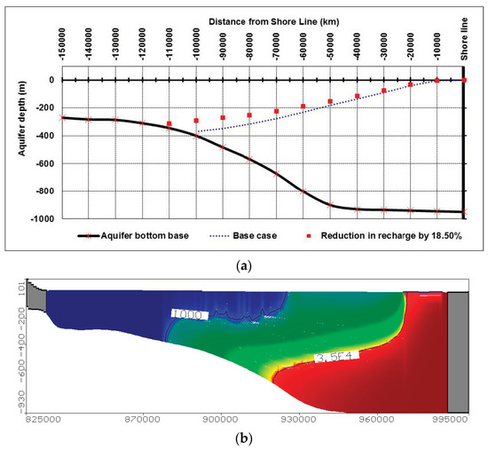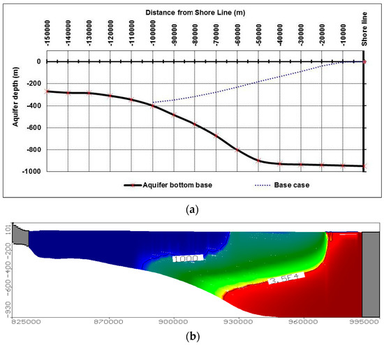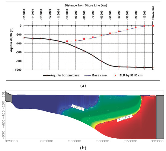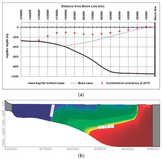 The solute transport model is calibrated by comparing the results with other models which was developed to simulate the current study area. The model results have been compared with the numerical models developed by [12,48,49] where good agreement was obtained between the results. Also, the SEAWAT results showed that the equi-concentration line 1000 ppm and 35,000 ppm reached to 101.66 and 63.80 km, respectively, as presented in Figure 5b and Figure 6a. The calibrated results of this case for both groundwater head and salinity distribution in the MNDA are used as a base case for further scenarios.