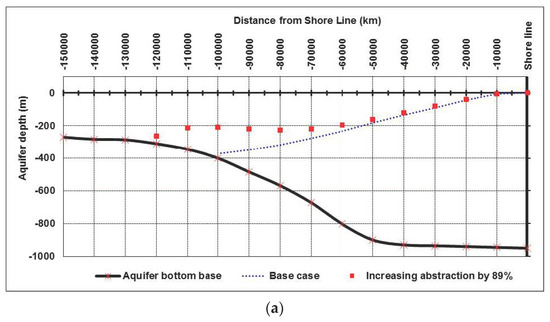 This scenario presents the combination of the previous three scenarios; SLR, decrease in Nile flow and increasing the abstraction rates from the ND aquifer. In this case, the intrusion length of equiconcentration line reached 131 km for analytical solution and 111.66 km for numerical solution respectively as shown in Figure 12a,b. The equi-concentration line 35 reached 68.94 km in the numerical model. The higher intrusion in the analytical solution is due to neglecting the abstraction force for saltwater compared with the numerical solution considering over pumping.