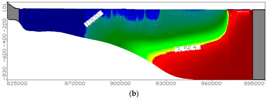 Salinity distribution in the MNDA using the numerical model. (a) Areal view, (b) Vertical cross section.