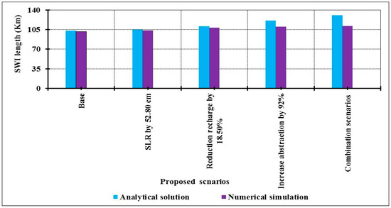 In this scenario an increase in the sea level by 52.80 cm at 2070 due to climate changes has been applied. The results showed that SLR has increased the intrusion length in both analytical and numerical models. A new position of the equi-concentration line 1 was detected in land direction. SWI was predicted and the intrusion changed with small values from the shoreline due to increasing the seawater level where intrusion reached 105 km in analytical model and 103.45 km for numerical model. Also, equiconcentration line 35 reached 65.03 km for the numerical model. The results showed that the two models’ results are very close, as shown in Figure 9a,b.