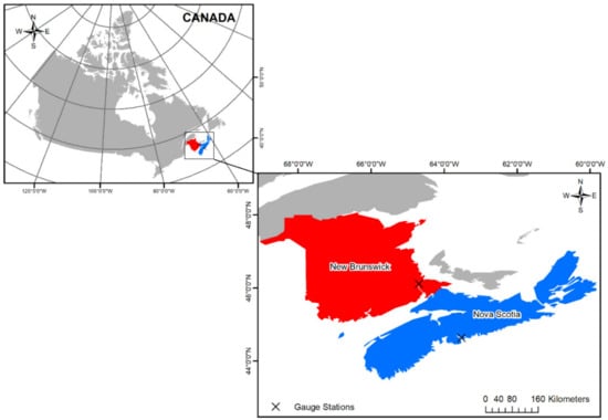 Moncton City is located at the Petitcodiac River, area bordered by the Atlantic Ocean, with a maximum height of about 70 m above sea level, and an average precipitation of 1146 mm/year. The Moncton City Köppen–Geiger classification is Dfb (short for a warm-summer humid continental climate [31]), and there is uniform precipitation distribution during the year. Halifax City is bordered by the Atlantic Ocean, lying 8 m above sea level. As Moncton’s, the climate of Halifax is classified as Dfb, with an average precipitation of 1410 mm/year, varying between the drier and colder months. A brief description of the stations used in this study is presented in Table 1. Datasets are available through the Environment and Climate Change Canada. Series of 5 min, 10 min, 15 min, 30 min, 1 h, 2 h, 6 h, 12 h and 24 h duration rainfall can be downloaded from https://climate.weather.gc.ca/prods_servs/engineering_e.html (accessed on 15 November 2020) for the available period.