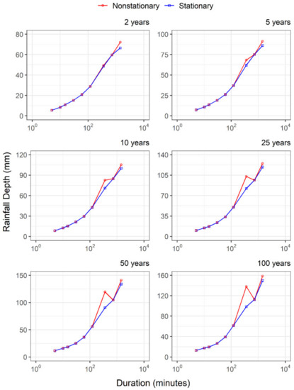Based on the best-fitted GEV models for different durations of the observed data for Moncton and Shearwater stations, IDF relationships for 2-, 5-, 10-, 25-, 50- and 100-year return periods are developed using Equation (8) (Figure 3 and Figure 4). In addition, for comparison purposes, the IDFs for the stationary case (GEV-I) are also developed. This comparison provides some additional insights about the observed historical period. Overall, non-stationary IDFs differ for different durations and therefore the observed differences and relative changes (i.e., the percentual value of rainfall increment provided by the non-stationary model compared with the stationary model) do not follow a similar pattern. Therefore, given the different trends over durations, there are some cases in which rainfall depth for a lower duration appears as superior to the rainfall intensity for a higher duration (e.g., in Figure 4, the rainfall depth estimated for 360-min and 25-year is higher than the rainfall depth estimated for 720-min and same return period). These results are expected since the trend parameters are assessed for each duration, assuming an independence assumption [43]. In addition, the rainfall depth presented here is estimated using the inverse of GEV function which parameters’ behavior varies according to its assessed performance. Further, even being in the same geographic region, the difference in the observed time period between stations may lead to different trends associated with data (as the assessed GEV models indicated), and further to the estimated rainfall quantiles. Also, the type of the covariate used, i.e., time, may lead to different trends, while large-scale variables may produce more convergent results for the same climatic region [6].